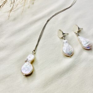 Natural White Freshwater Pearl Pendant & Earrings Set Flat Shaped